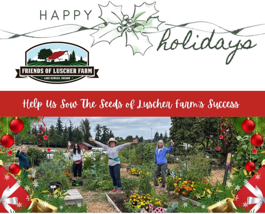 What a year it’s been at Luscher Farm! Thanks to community support, Friends of Luscher Farm helped welcome Lake Oswego’s new CSA operator, Wild Geese Farm, with funding for much-needed irrigation equipment. Friends of Luscher Farms’ dedicated Seed Starters grew over 2,500 plant starts, and their Harvest Helpers delivered more than 4,000 pounds of fruits and vegetables to local organizations feeding our neighbors—Hunger Fighters Oregon and LO Meals on Wheels.